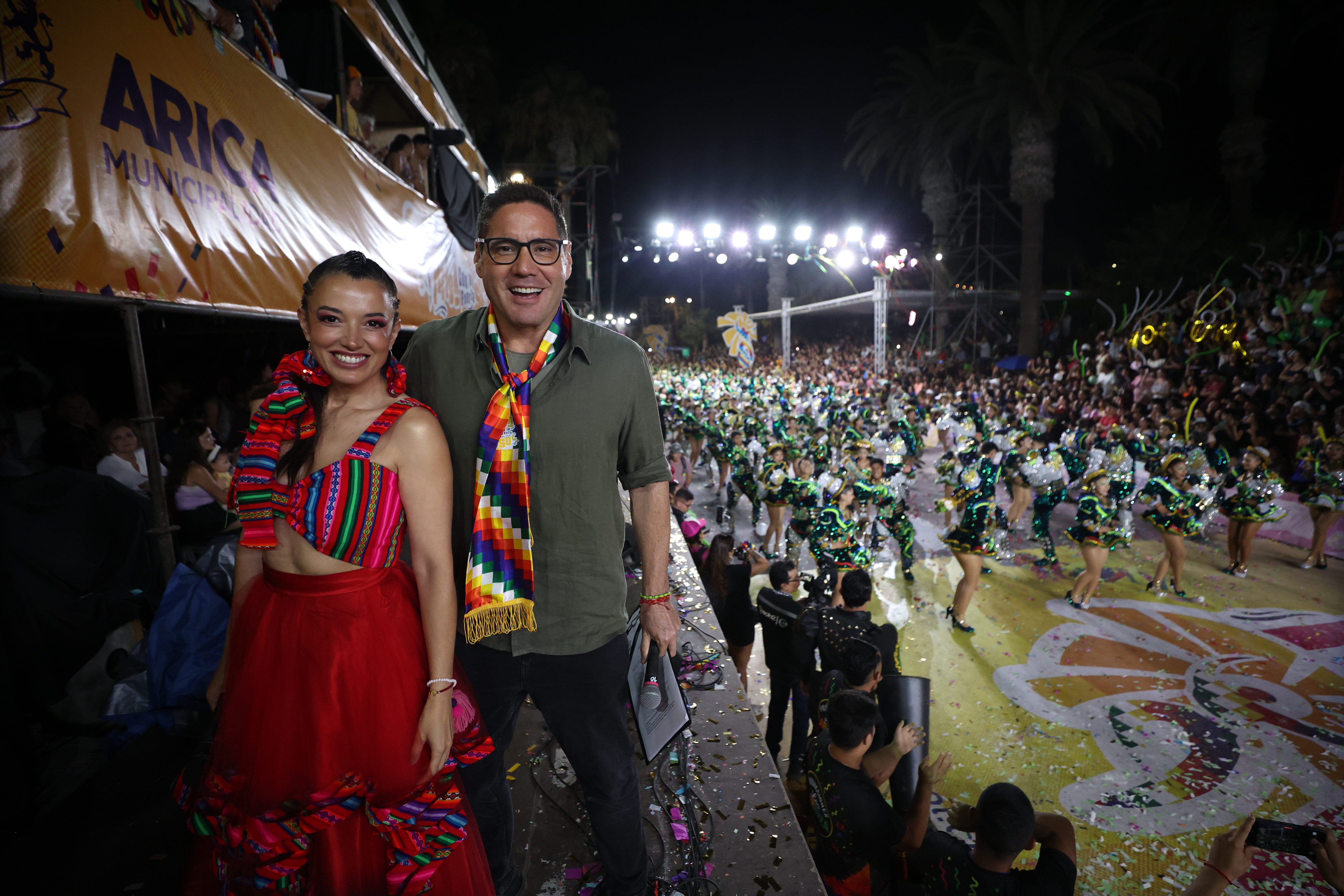 El traspaso de energía fue espectacular. Yamila Reyna y Pancho Saavedra sobre el escenario principal animaron un espectáculo sin igual. Las estrellas de televisión quedaron fascinadas viendo bailar a los hombres y mujeres que brillan en el Carnaval Andino “Arica con la Fuerza del Sol”.